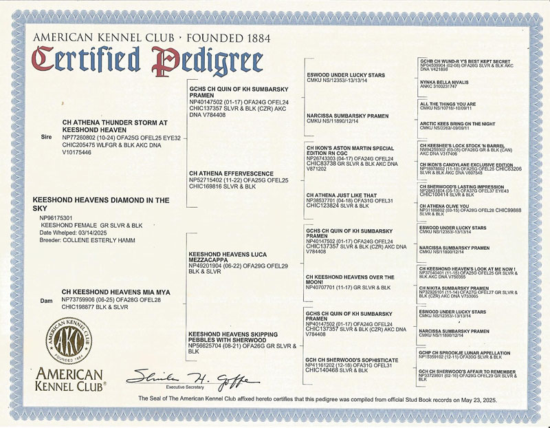 Some of my female Keeshond mothers are featured on this page. Below is a complete list: of their names and birthdates. Click on a name to see photos.